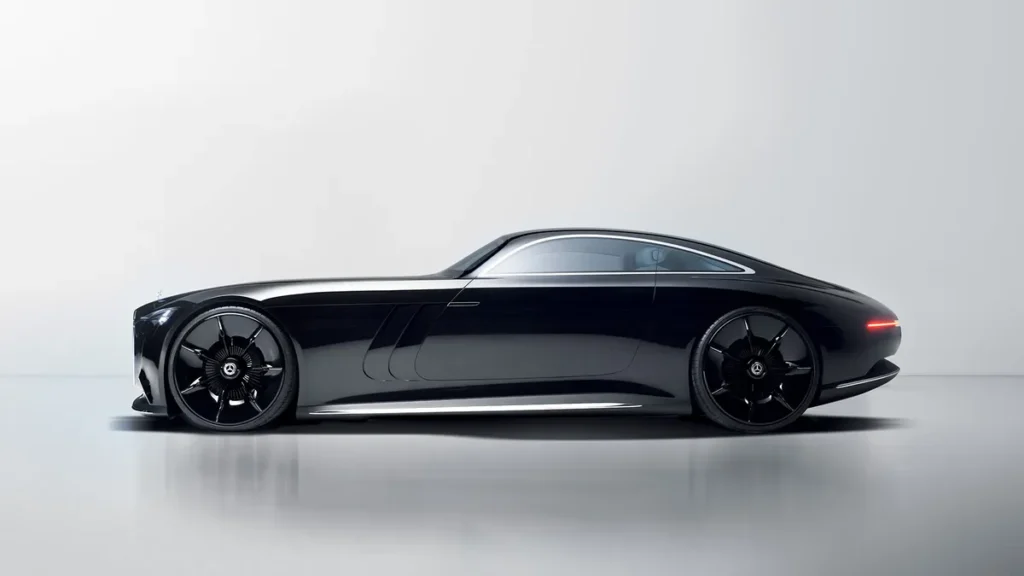 Den dype svarte lakken på Vision Iconic EV er mer enn bare estetikk. Mercedes eksperimenterer med et såkalt «Solar Paint», en overflate som kan produsere energi fra sollys og dermed øke bilens rekkevidde. Innvendig kombineres Art Deco-inspirert interiør med digital teknologi.