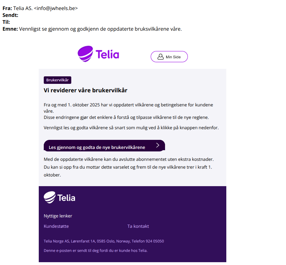 E-posten er laget for å se ut som en ordinær melding fra Telia, komplett med knapp og lenke for å «godta nye bruksvilkår». Men lenken leder ikke til Telias nettside. I stedet sendes mottakeren videre til en falsk side som ber om sensitiv informasjon – eller i verste fall installerer skadelig programvare.