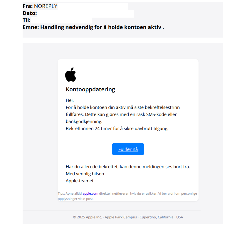 - Språk og utforming er mindre profesjonelt enn ekte Apple-kommunikasjon.